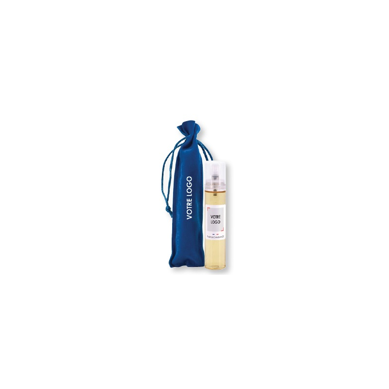 Un spray d’ambiance personnalisable 30 ml fabriqué en France, présenté avec son étui en suédine.