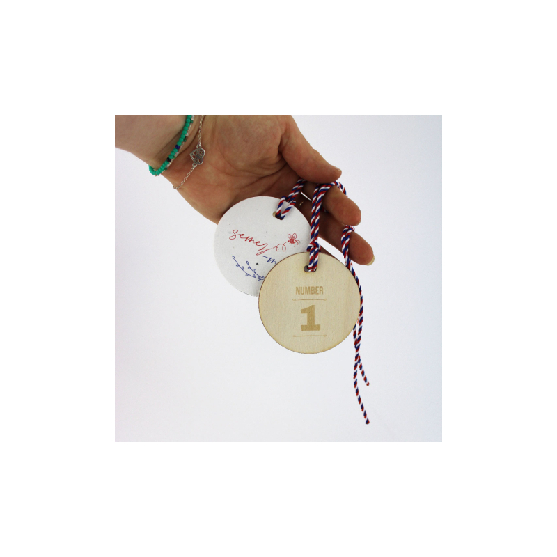 • Personnalisation : gravure sur une face de la médaille bois (Ø40 mm max).