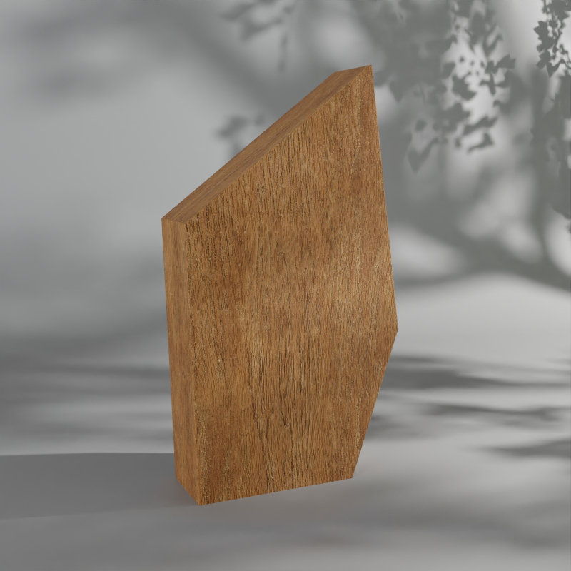 Réalisé en hêtre massif, ce trophée adopte une forme verticale rectangulaire à la silhouette asymétrique. Son sommet incliné et ses arêtes nettes lui confèrent une présence visuelle affirmée, adaptée aux remises de prix et événements institutionnels.