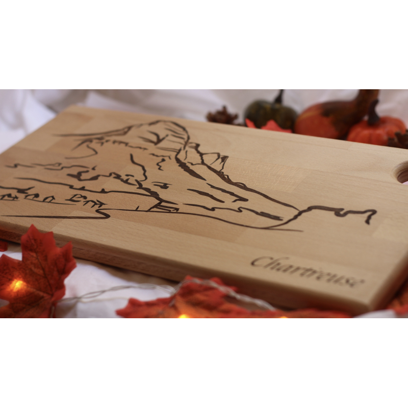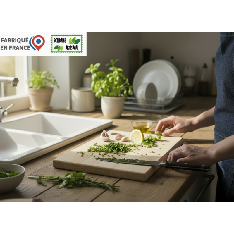 Une planche à découper en bois conçue pour associer grande surface d’usage et communication durable.