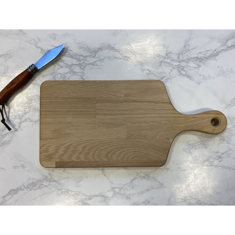 Une planche à découper en chêne conçue pour associer robustesse, utilité et communication durable.